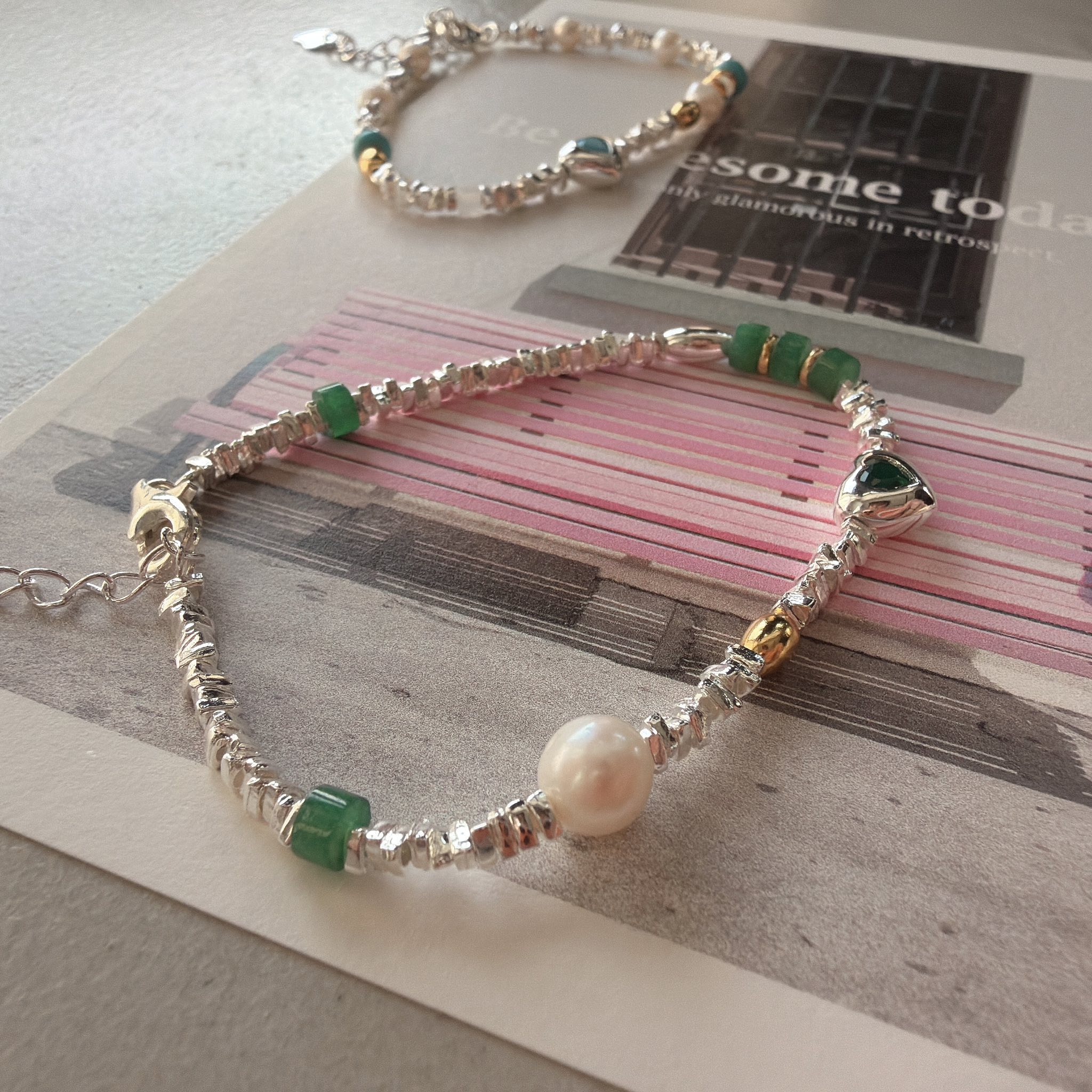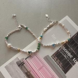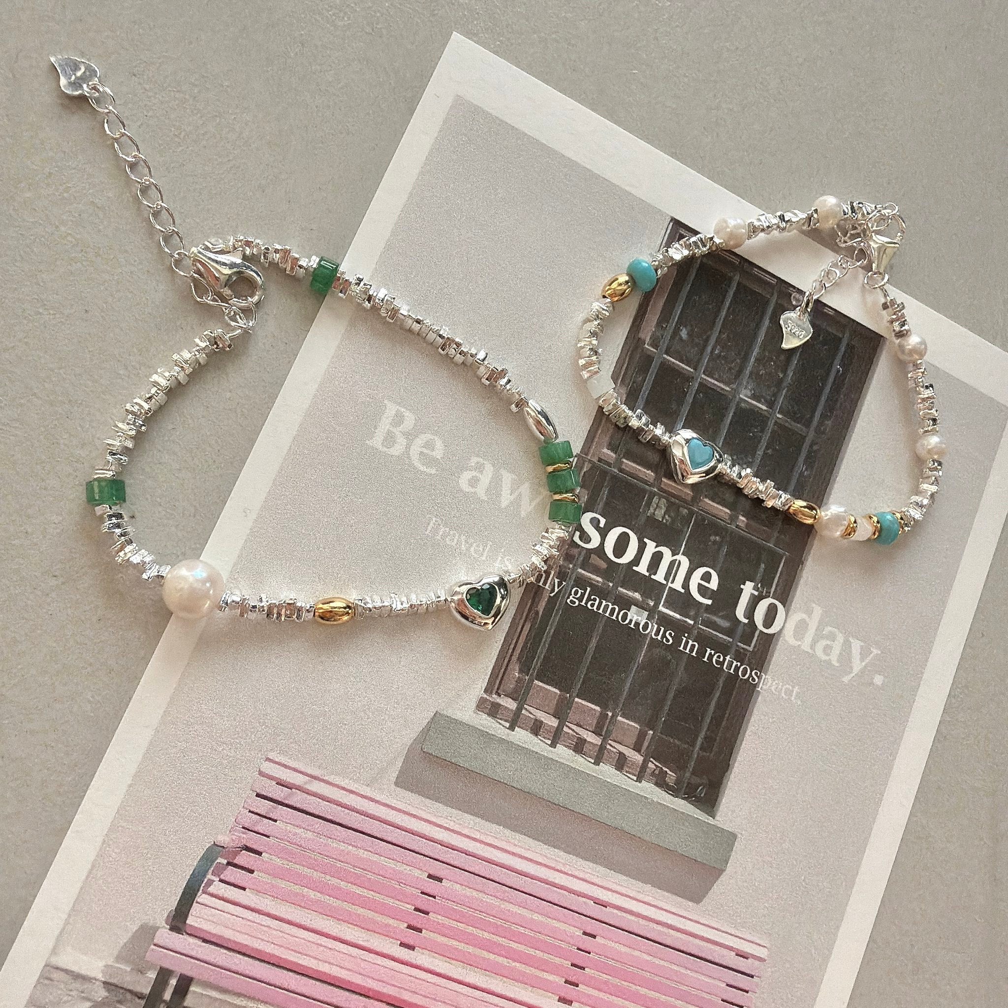 韓國連線 BJ09 精緻不規則方塊銀拼珍珠愛心寶石925純銀手鍊