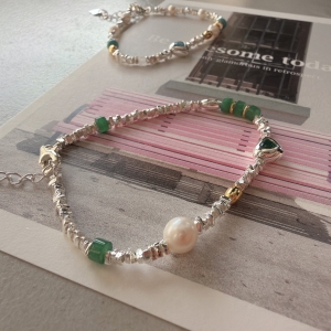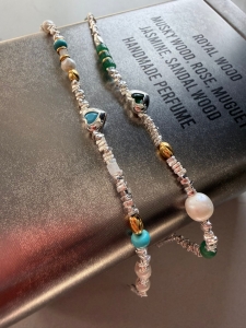 細緻銀方珠搭配 天然珍珠,綠、藍石做層次點綴,
