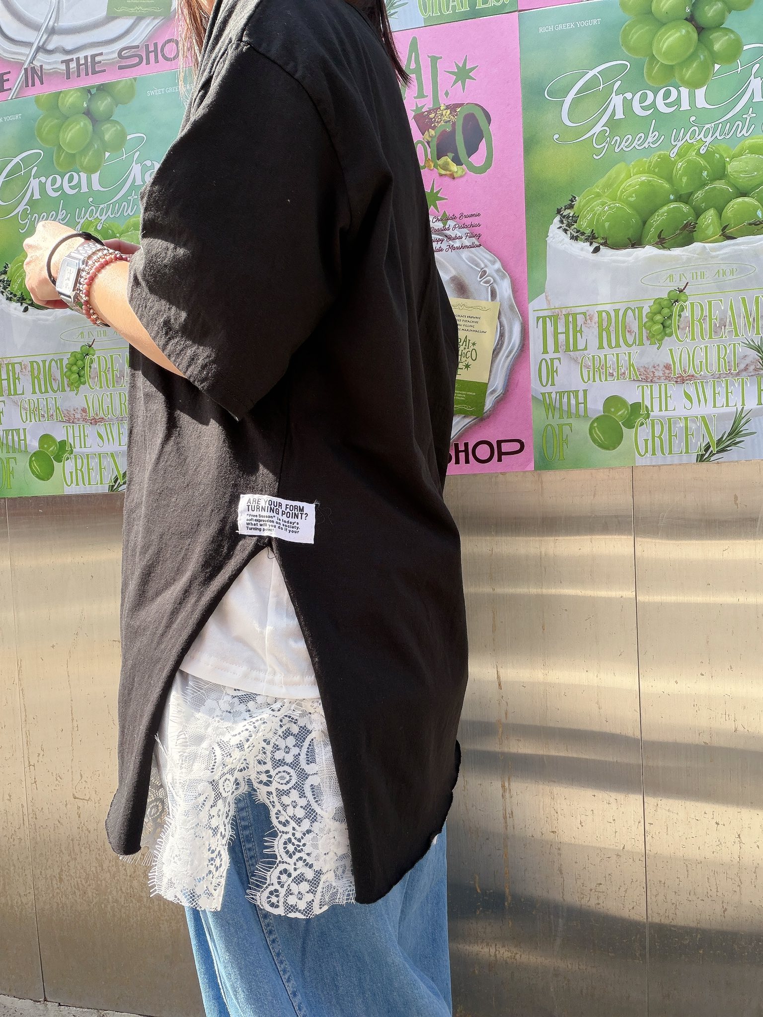 韓國連線 BL118 (質感布料)下斜拼蕾絲開叉長T