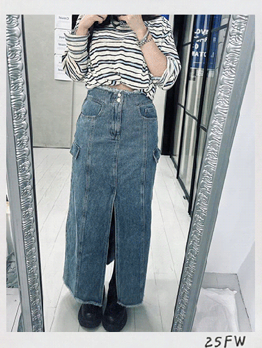 • 韓國連線 BH21 前開叉鬚邊牛仔長裙 NT.$1568