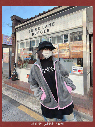 整件以灰色為主體,拉鍊、口袋與下擺採用粉色滾邊設計,