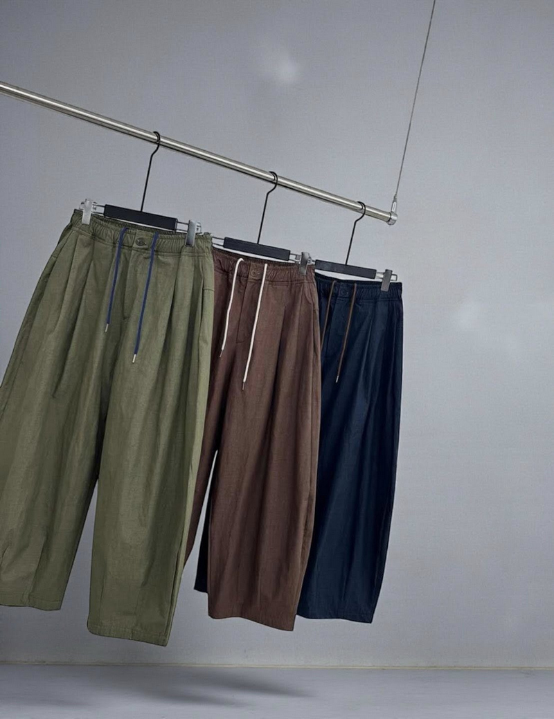 腰頭立體打摺+整圈鬆緊抽繩,舒服到像休閒褲,但版型又有「褲型感」