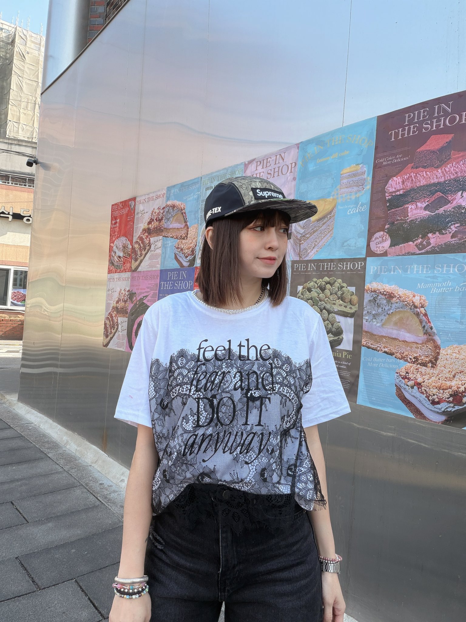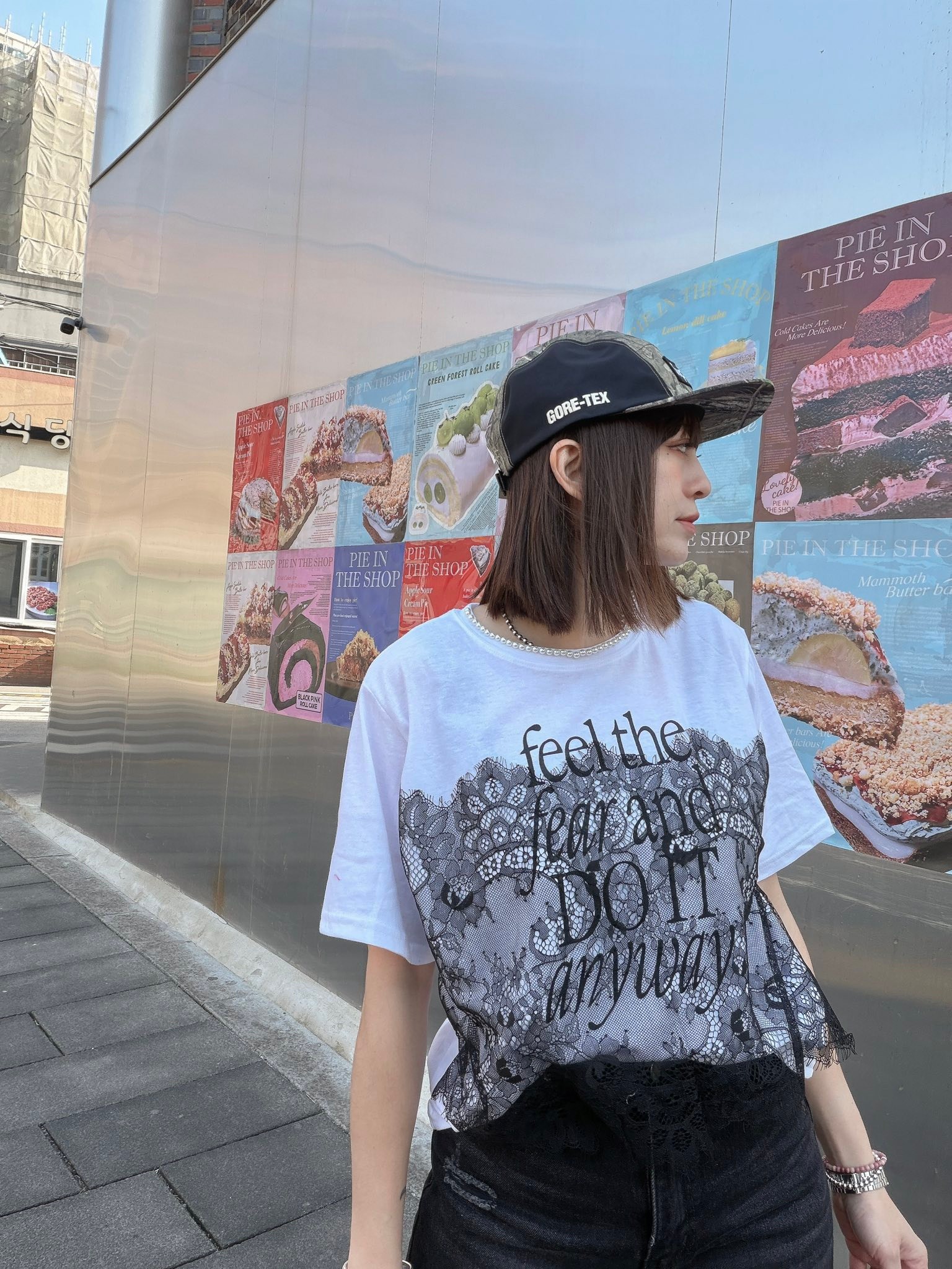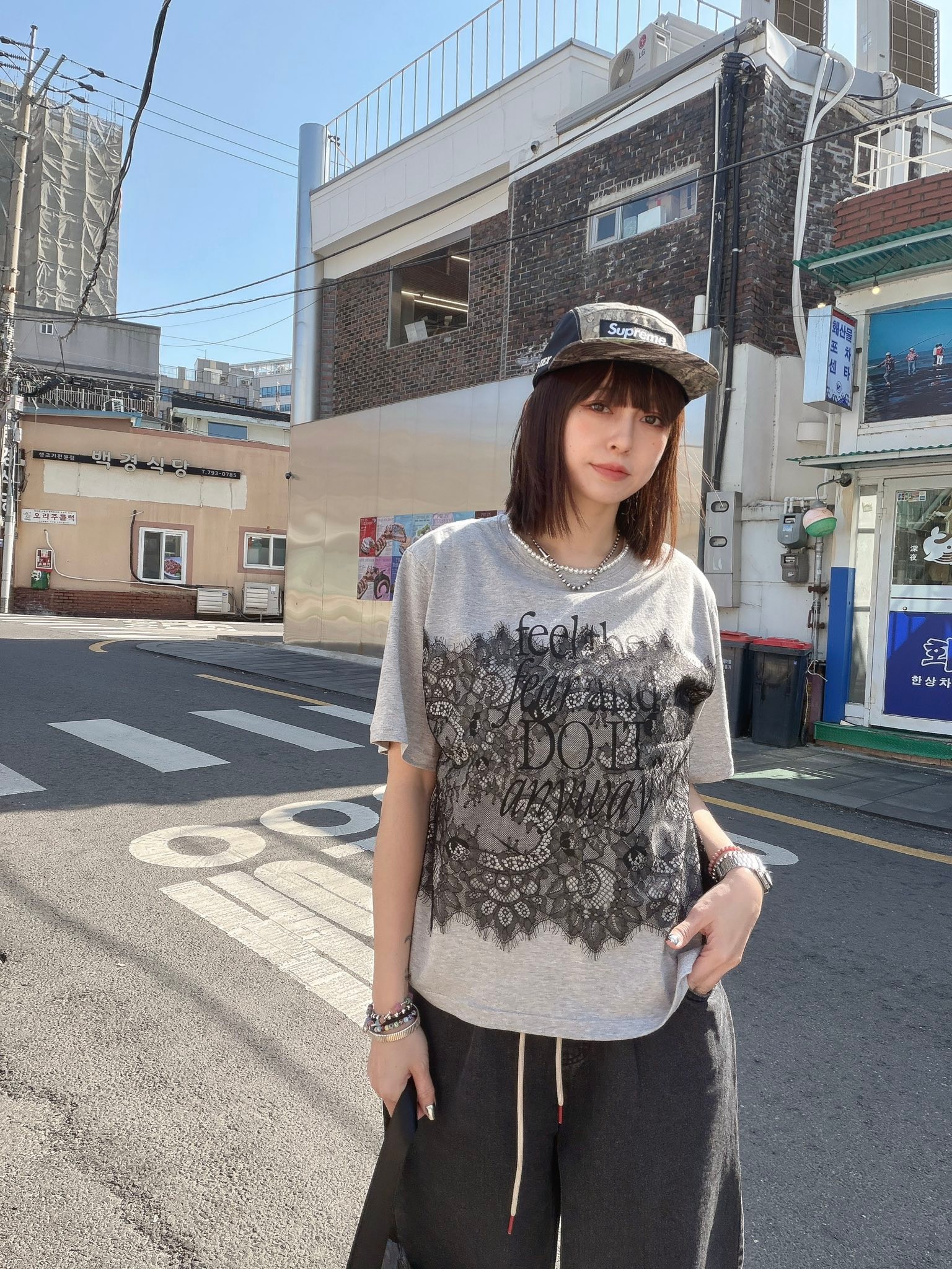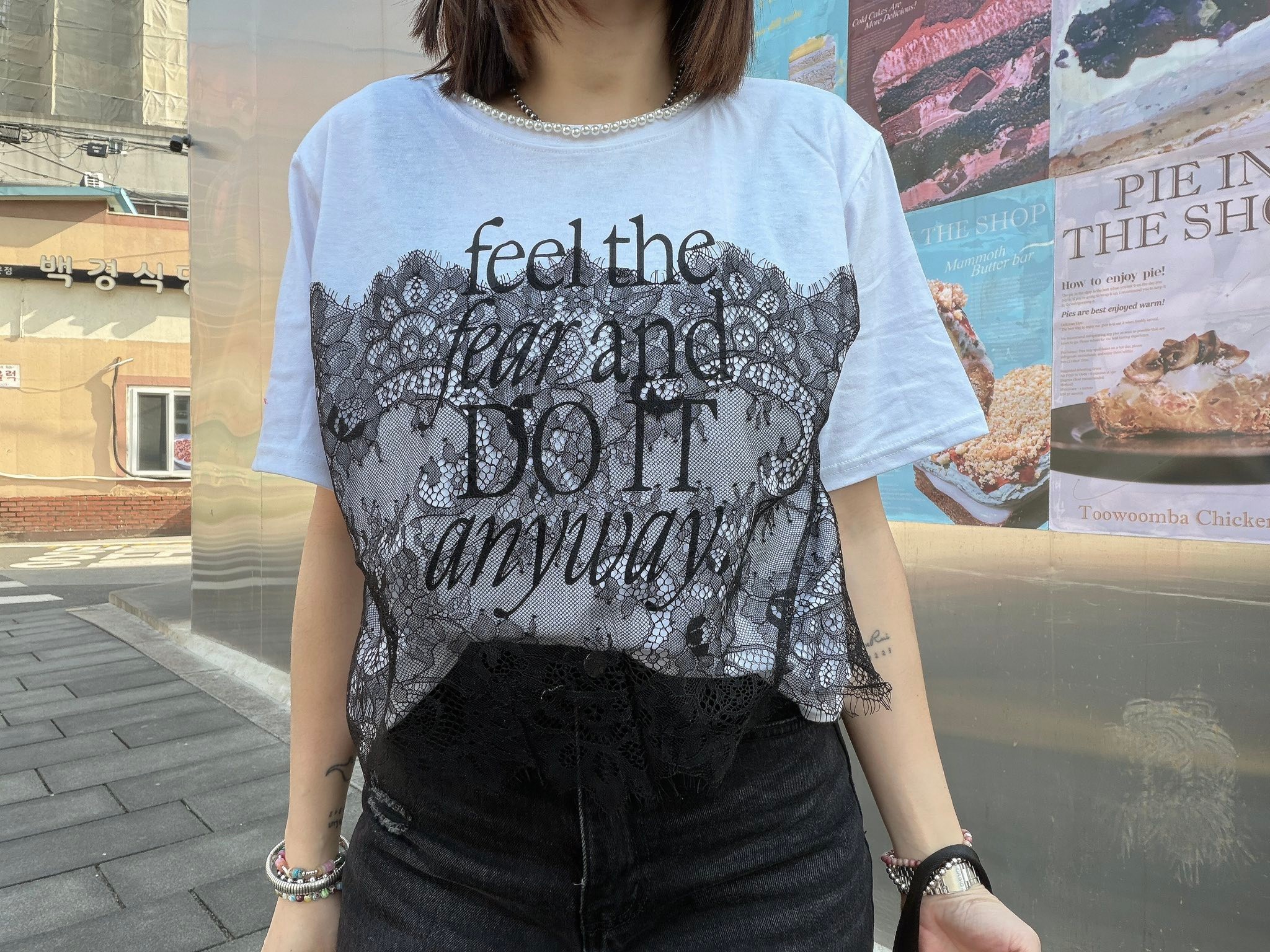 韓國連線 BL40 珍珠領口蕾絲拼英文T