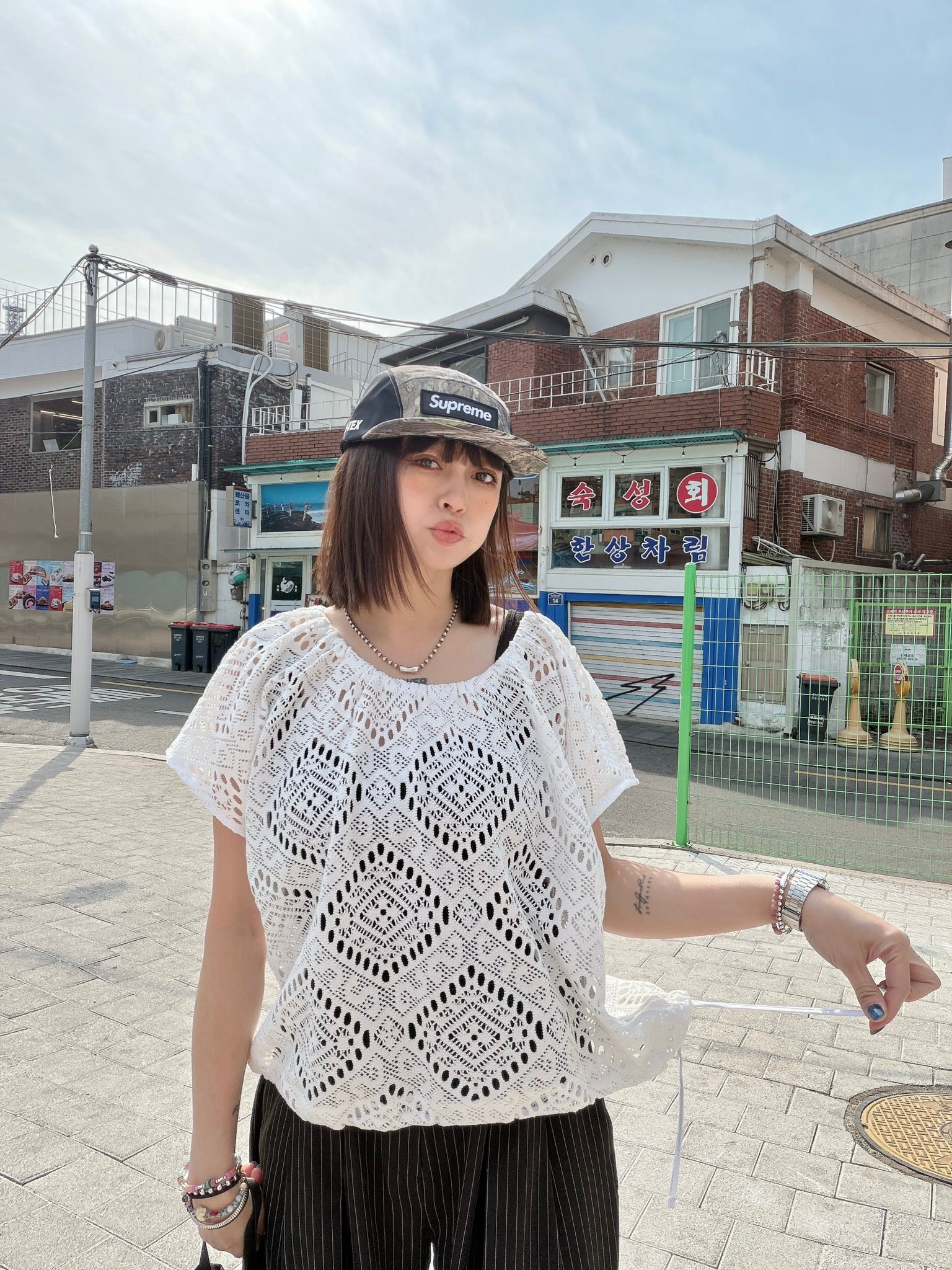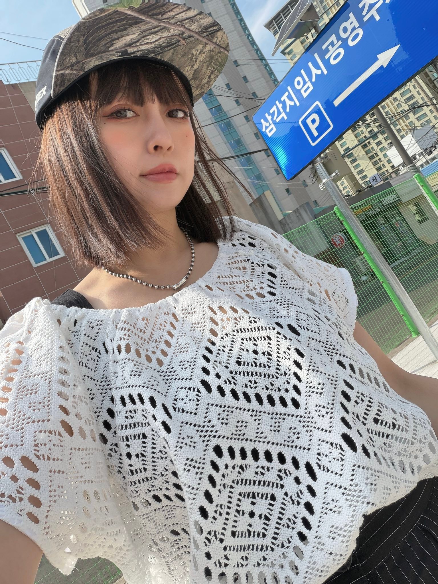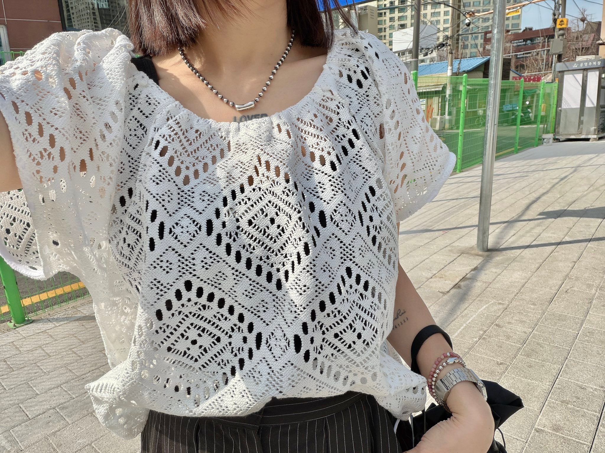 整件以 細緻鏤空編織工藝打造,菱形幾何圖案讓布料看起來更有層次與質感。
