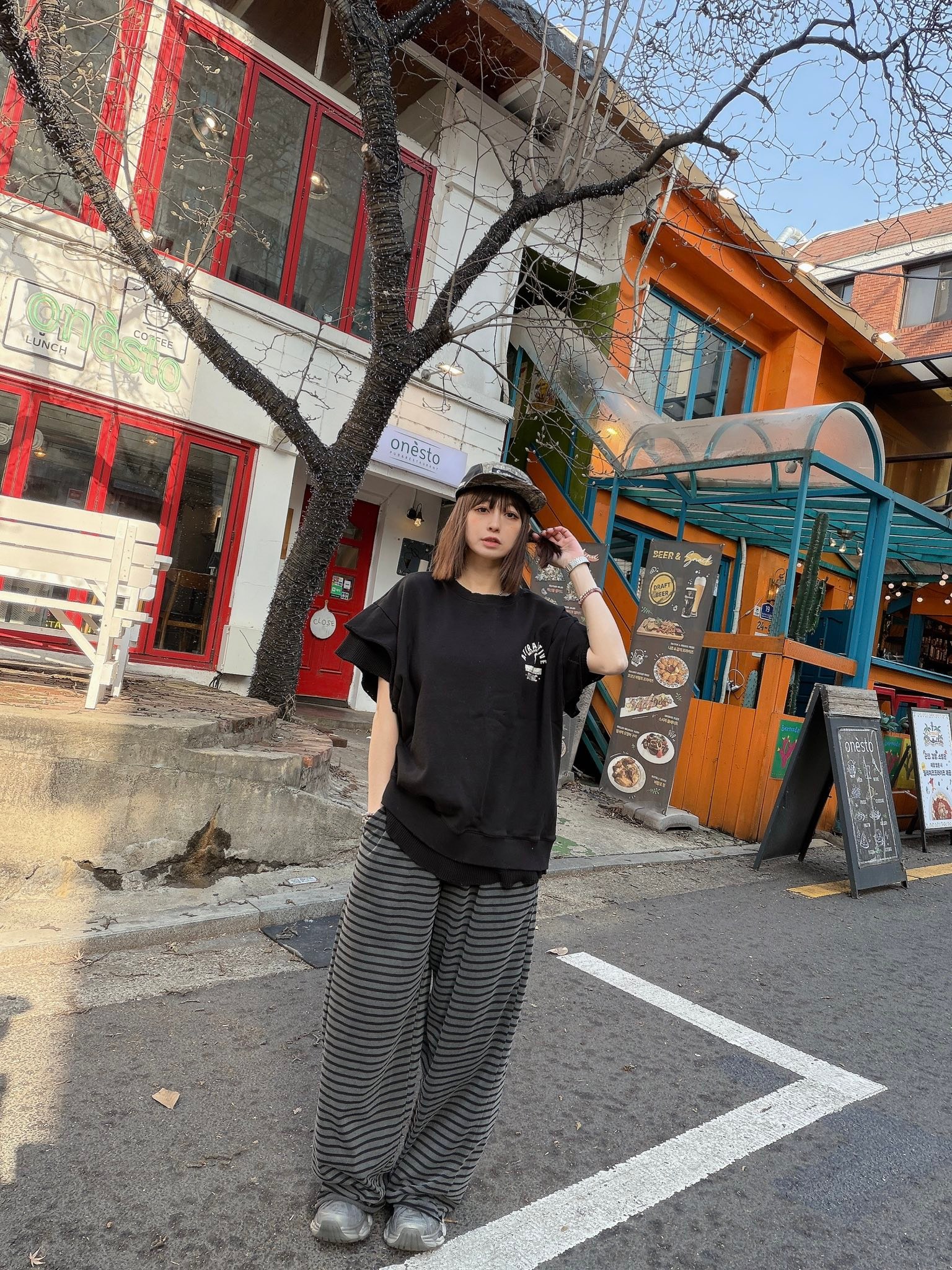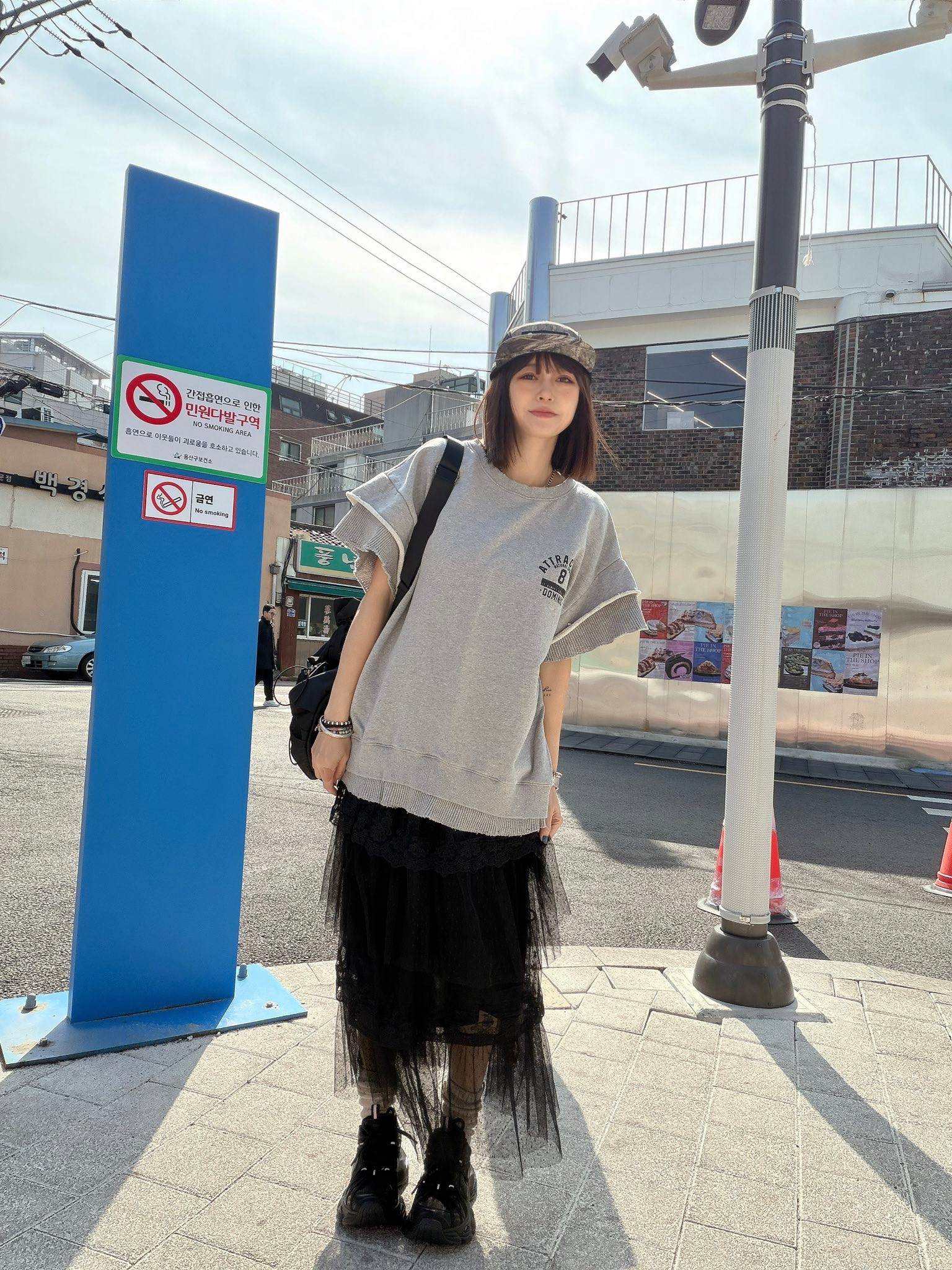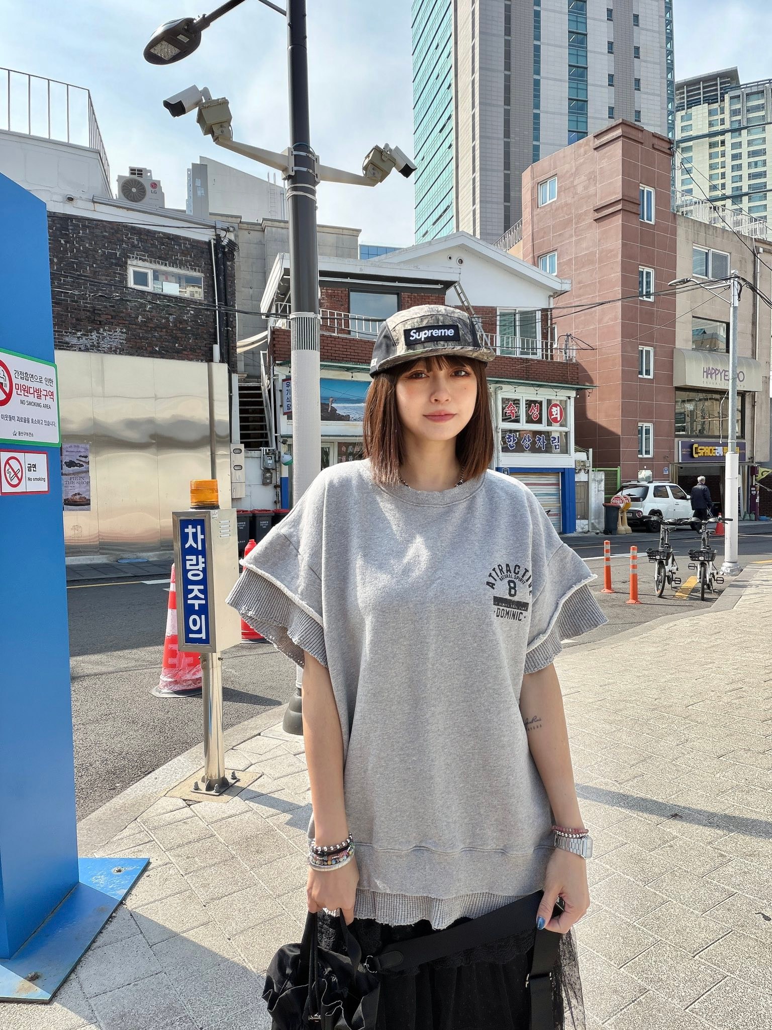 袖口和下擺做了羅紋拼接設計,讓簡單的灰色上衣多了層次與立體感,看起來更有設計感,不是普通素T。