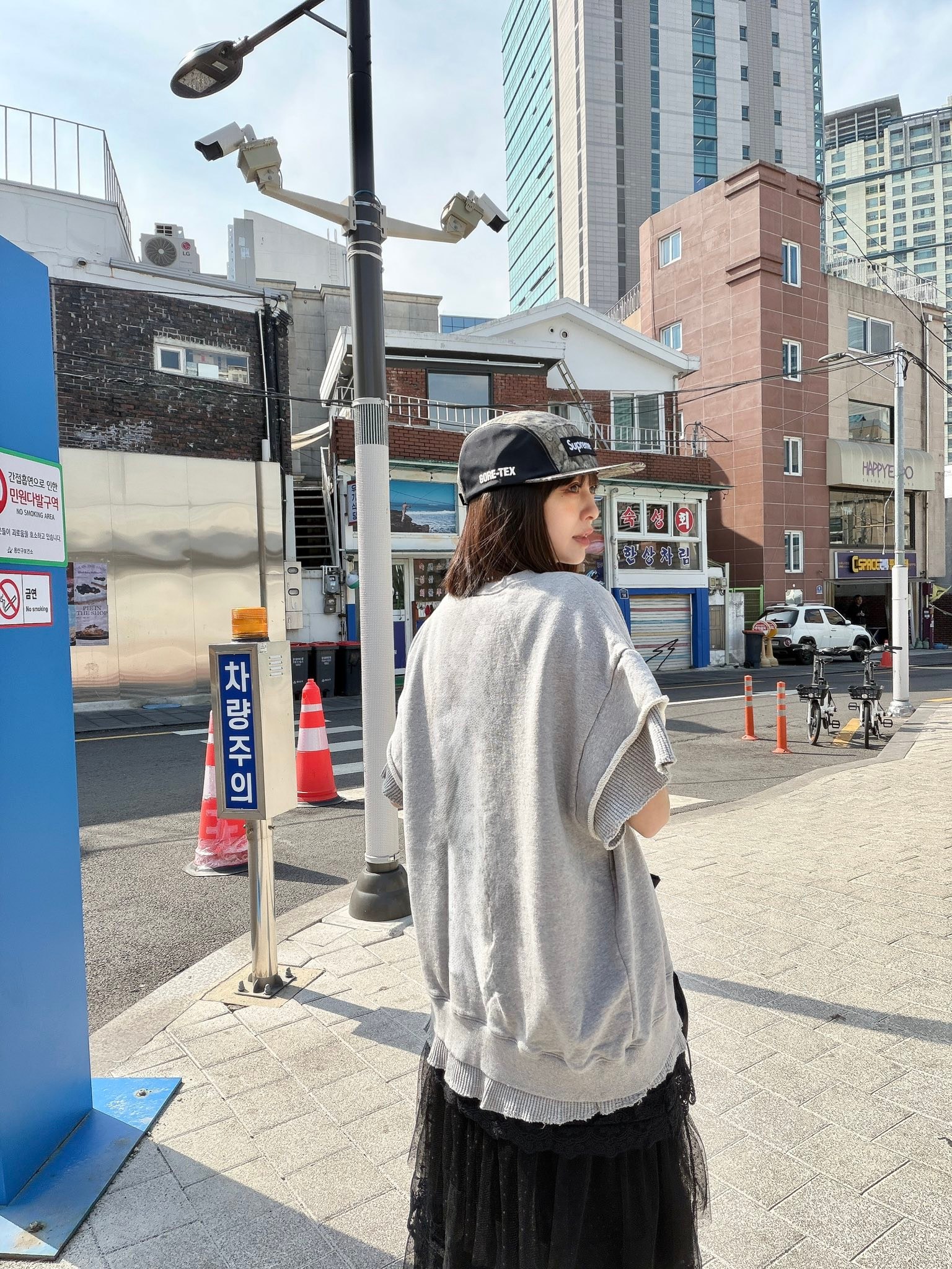 外層是柔軟的灰色棉質上衣,搭配內層帶有破壞設計功法羅紋!拼接袖口與下擺,
