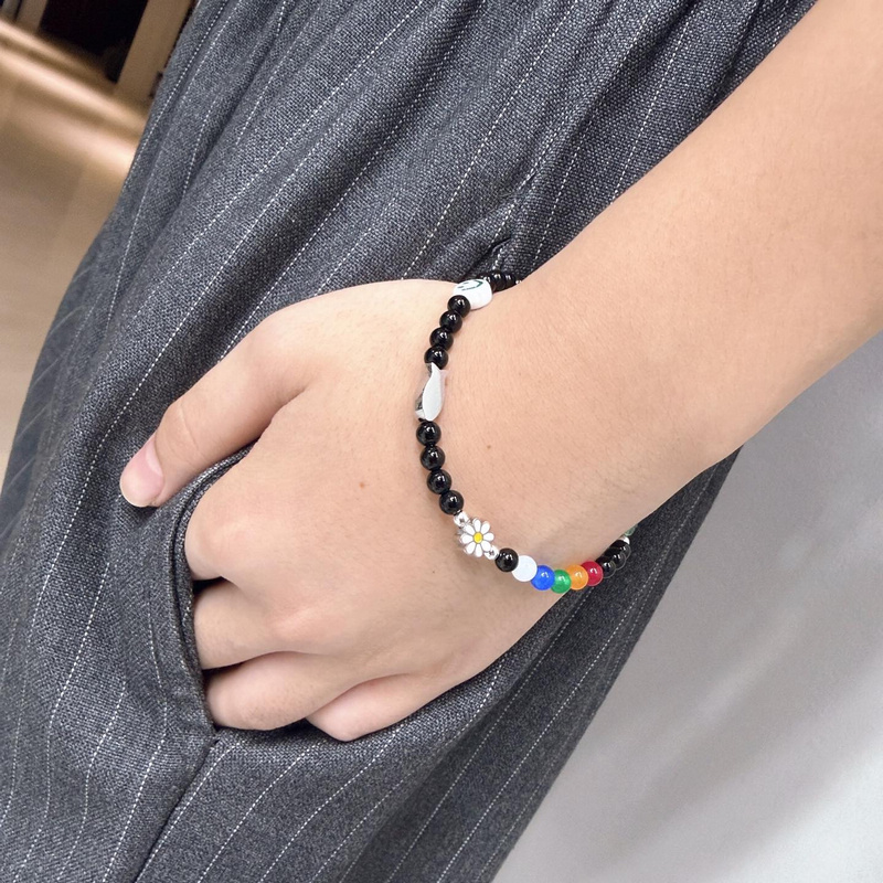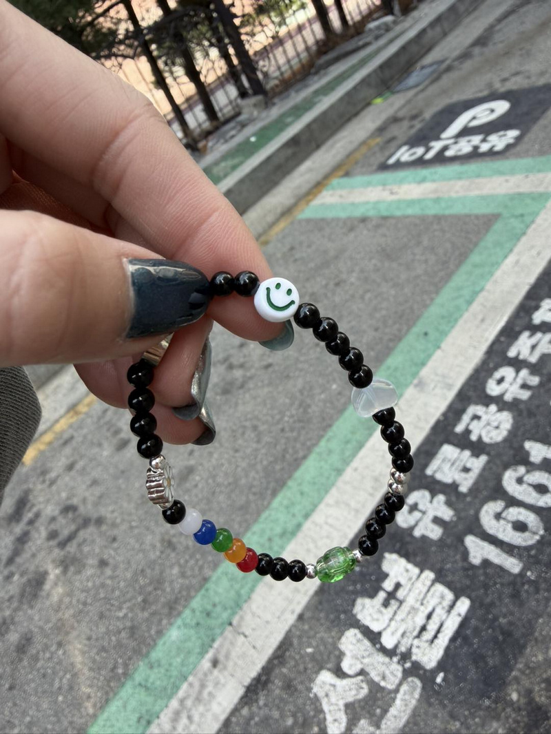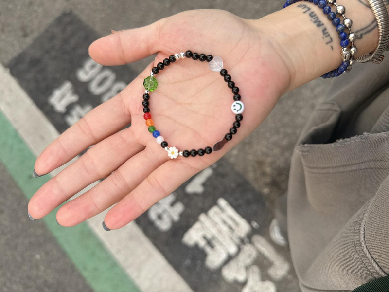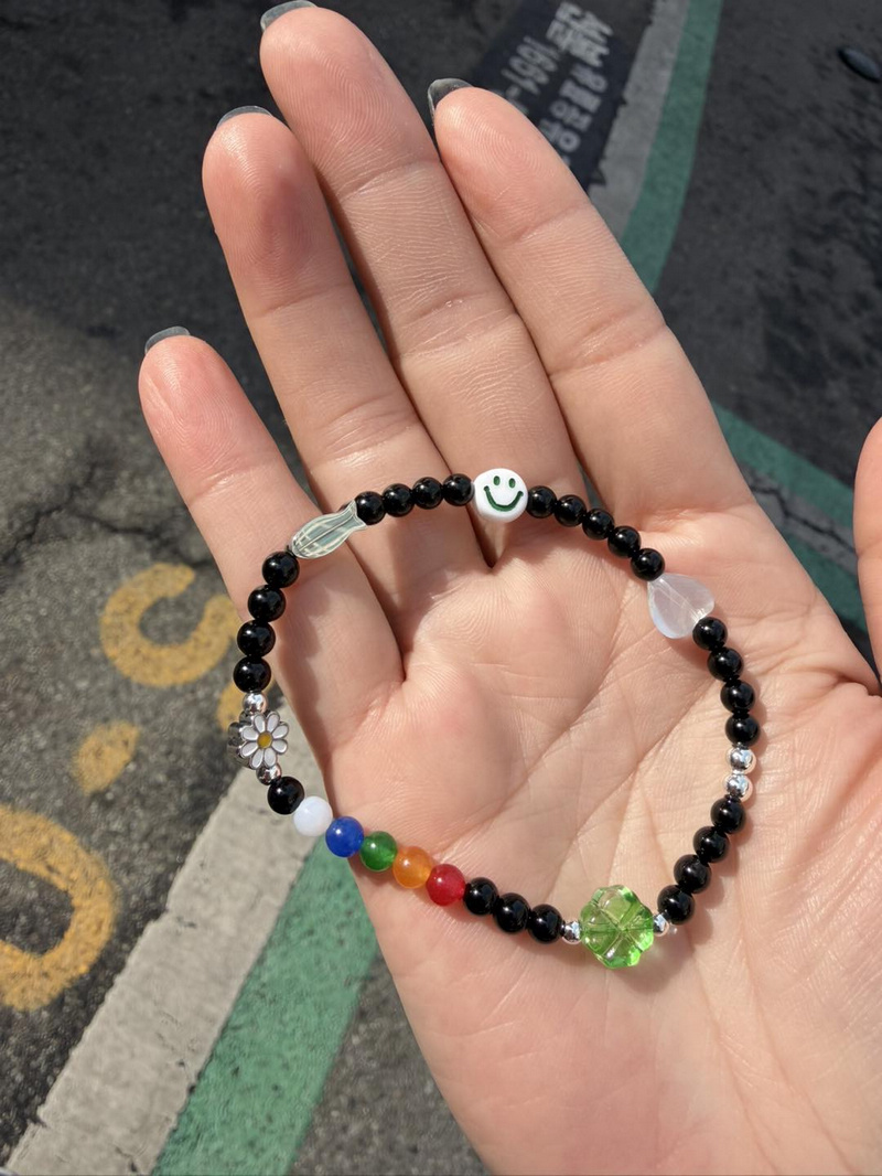 還穿插了 魚造型飾件、五彩珠、笑臉、小花、透明愛心感配件與綠色幸運草造型珠飾,