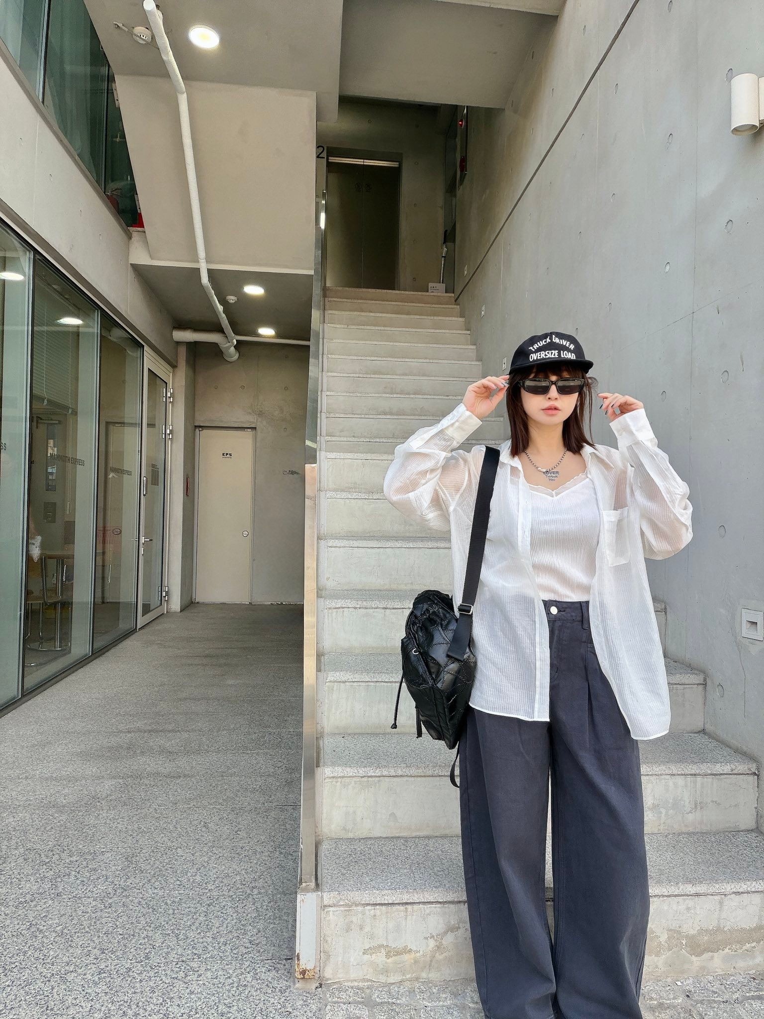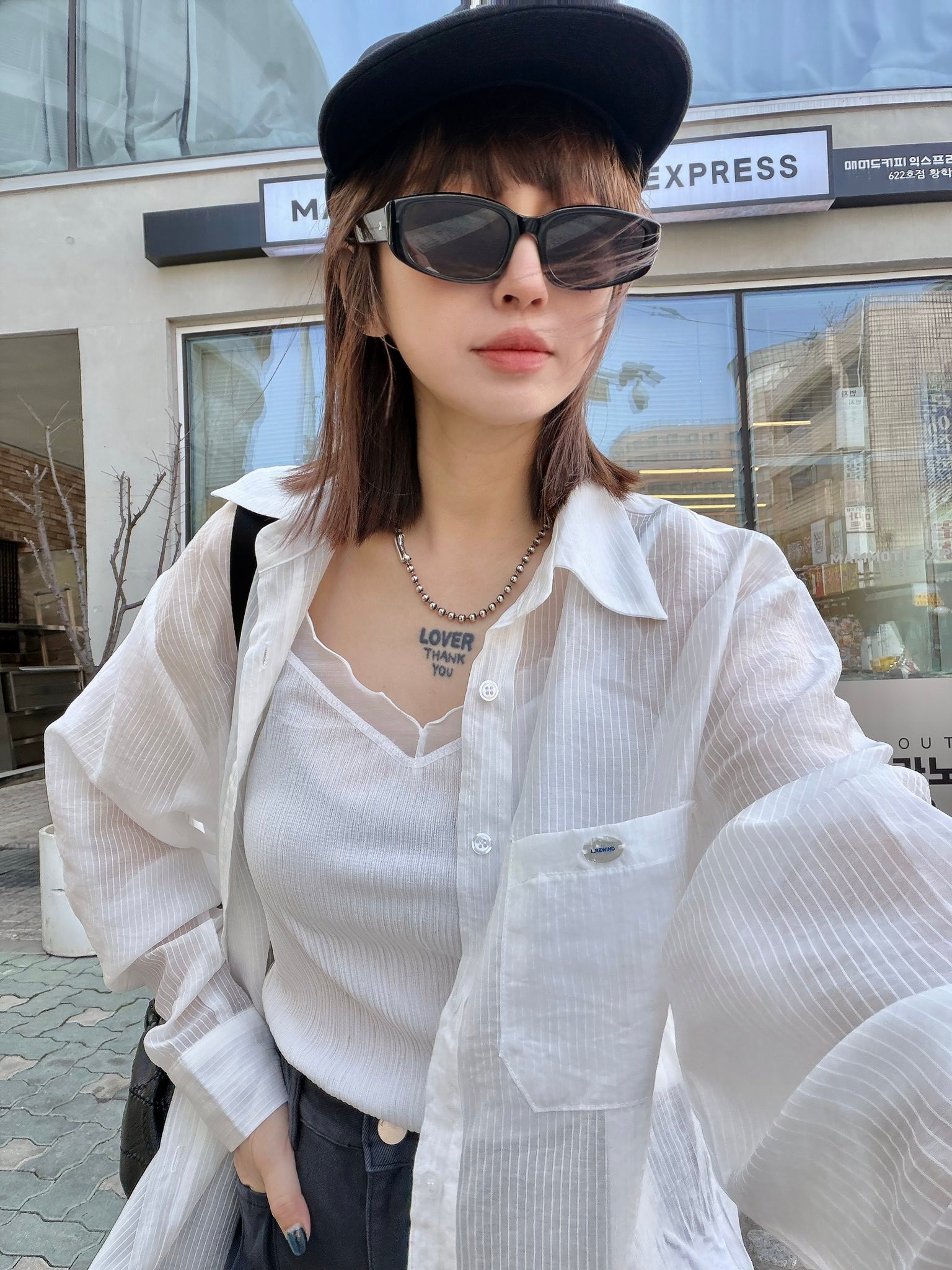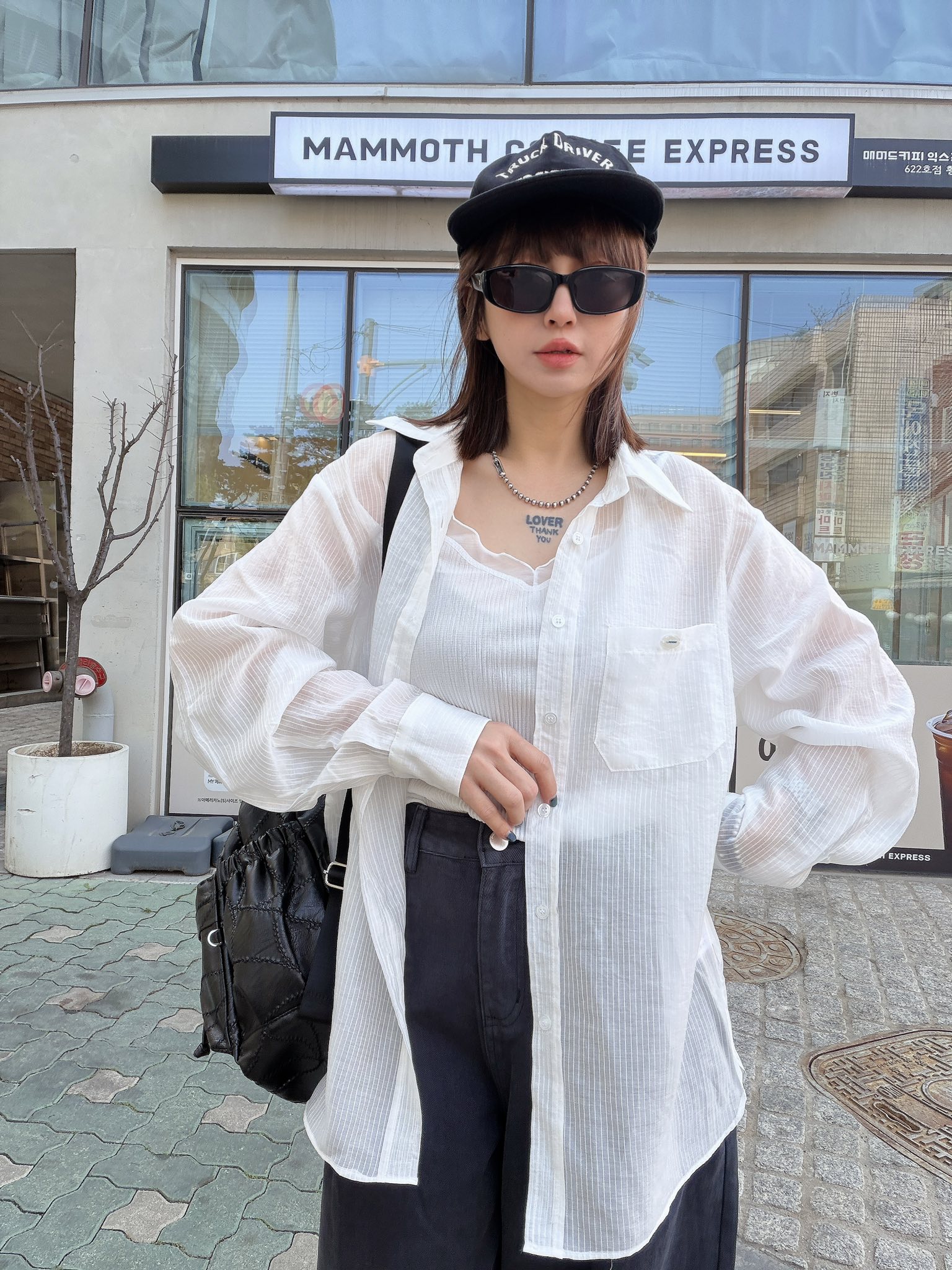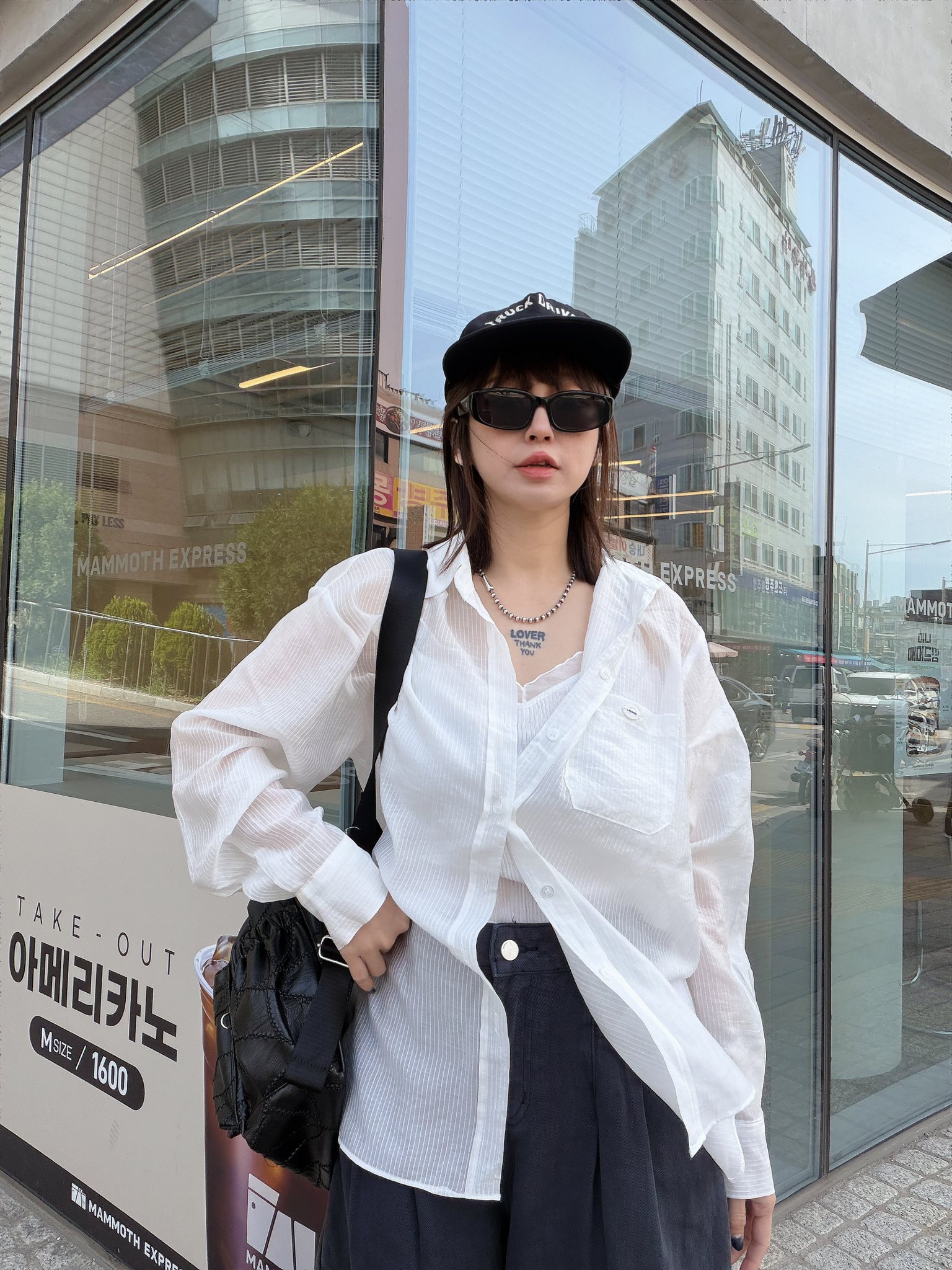 整體是 微透輕薄感布料,搭配細緻直紋紋理的布料看起來更有層次,也讓白色不會顯得太單薄。
