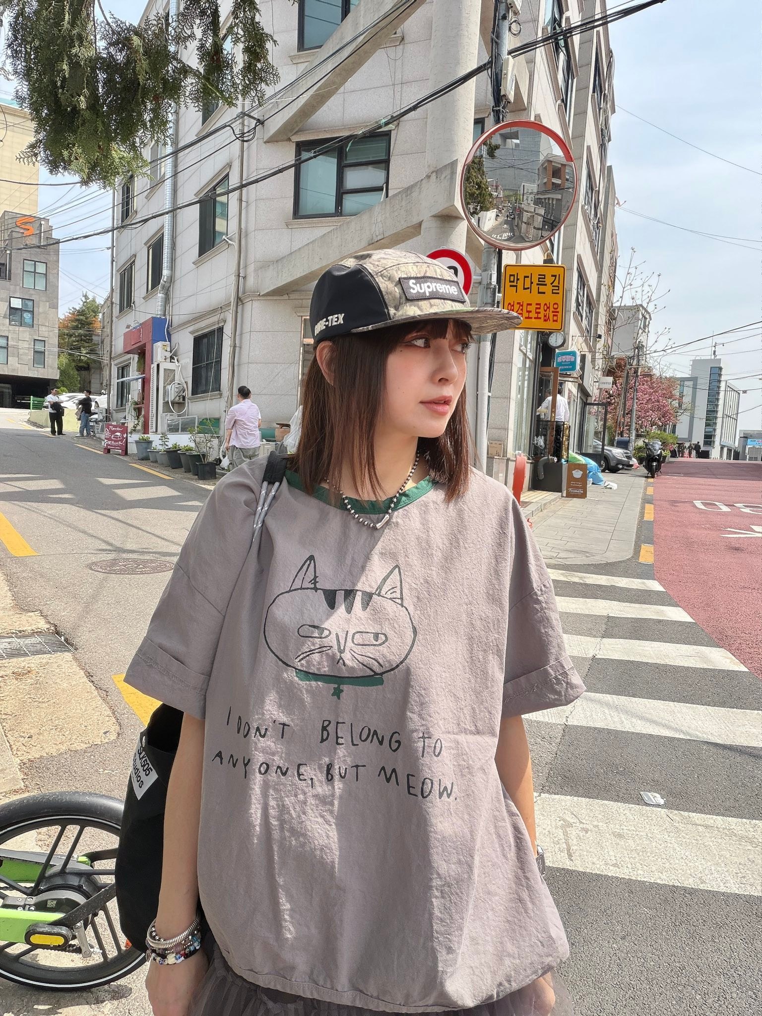 這件灰色底布料加上貓咪的塗鴉!搭配綠色滾邊!