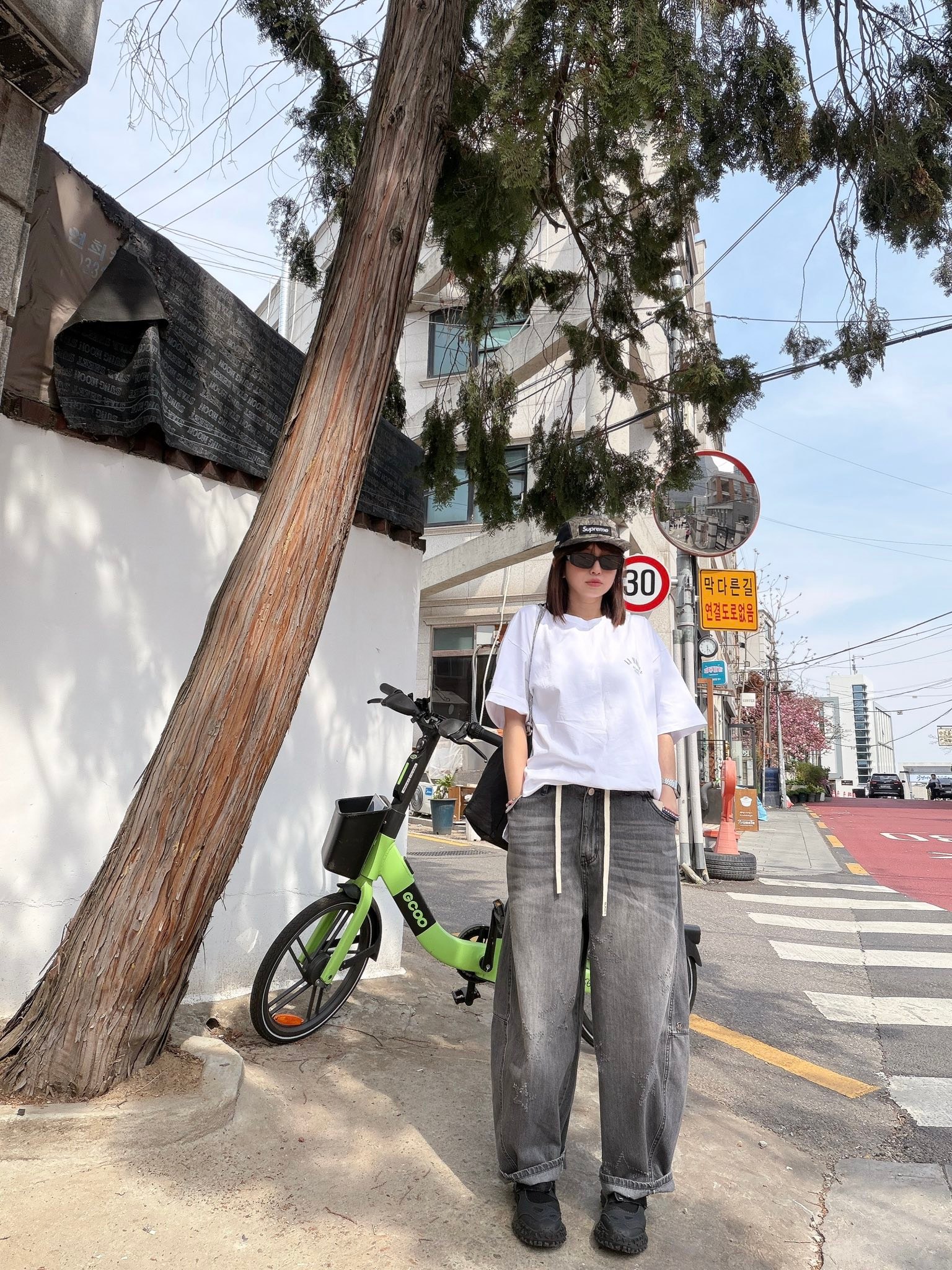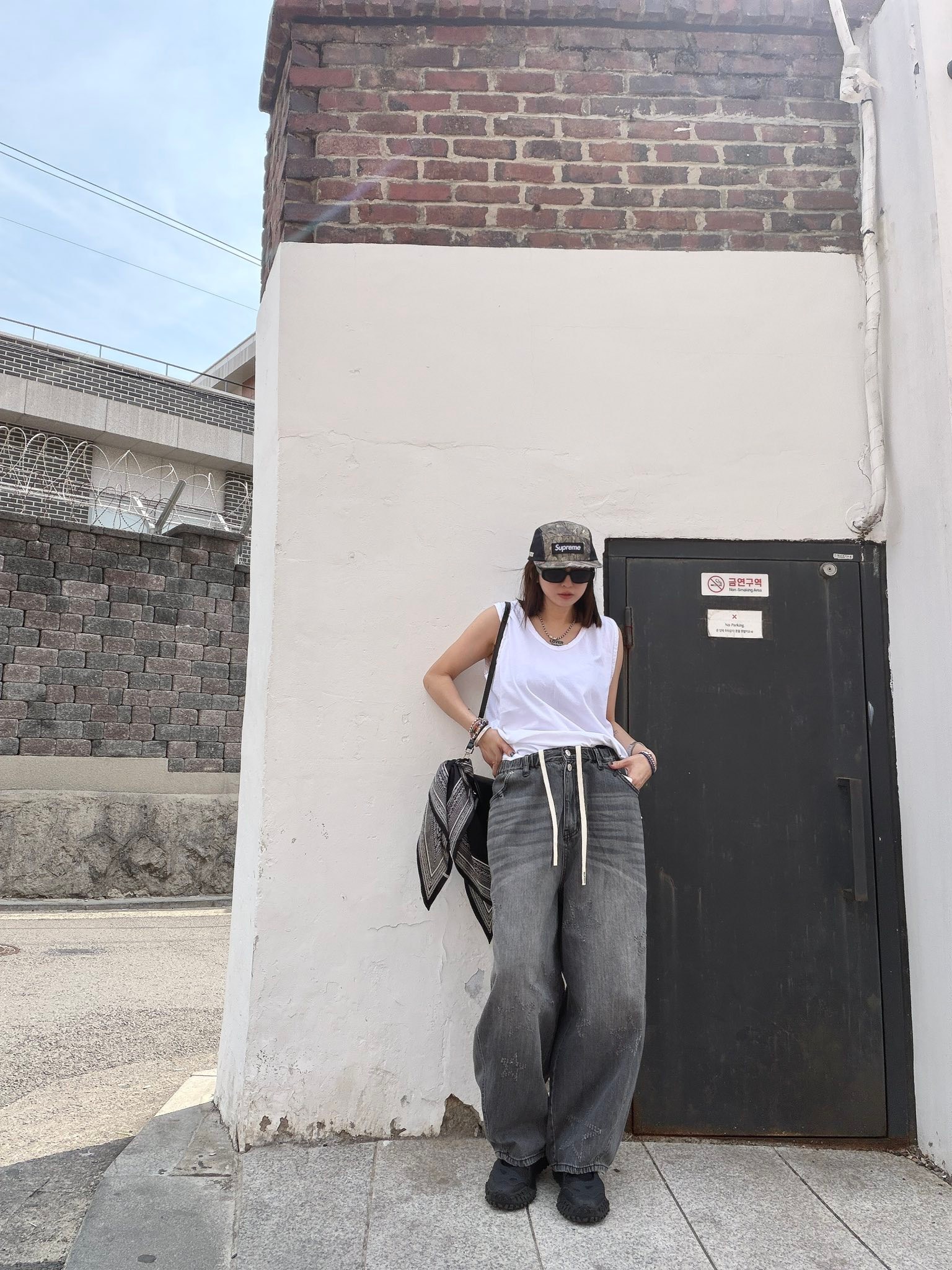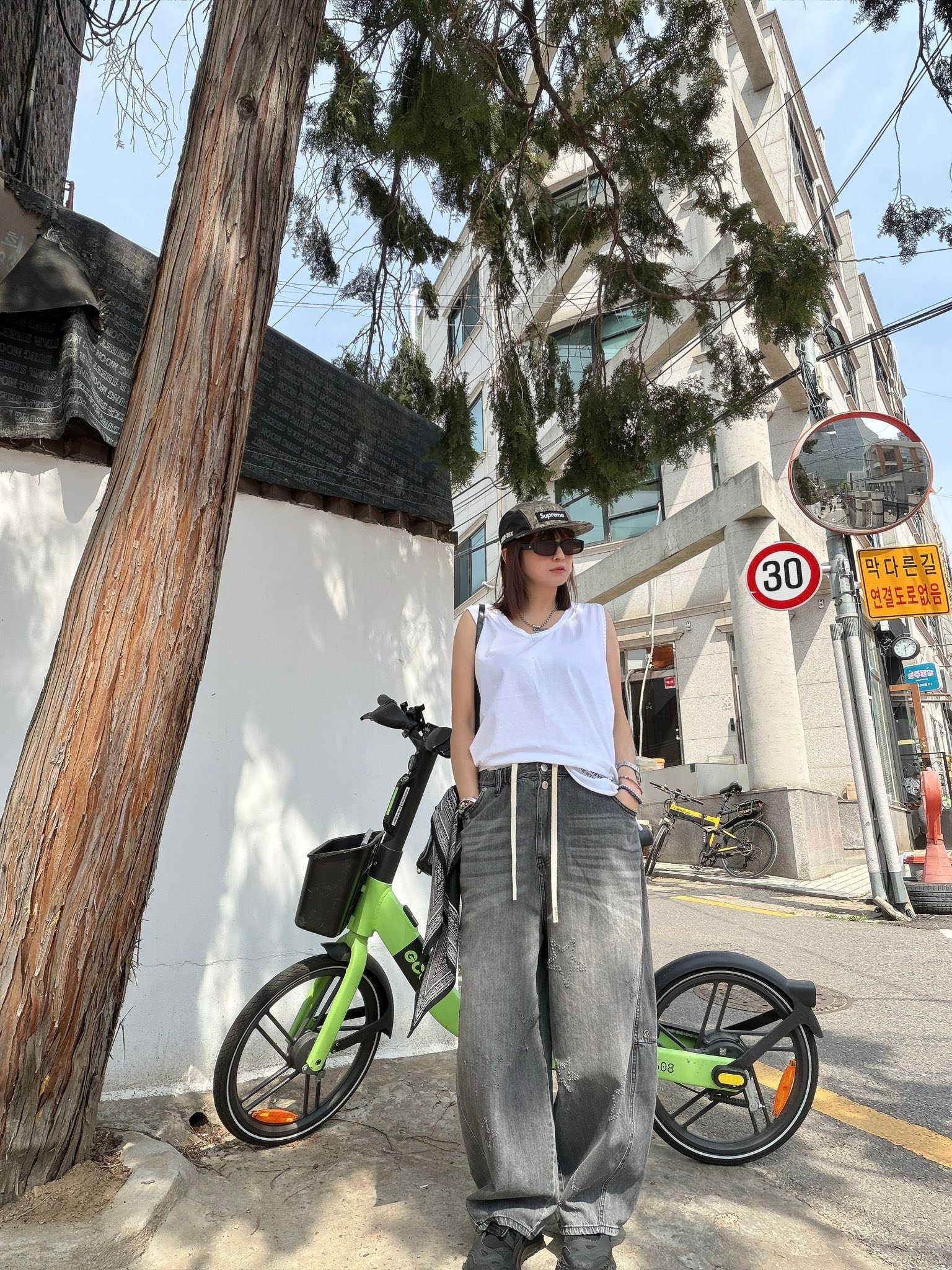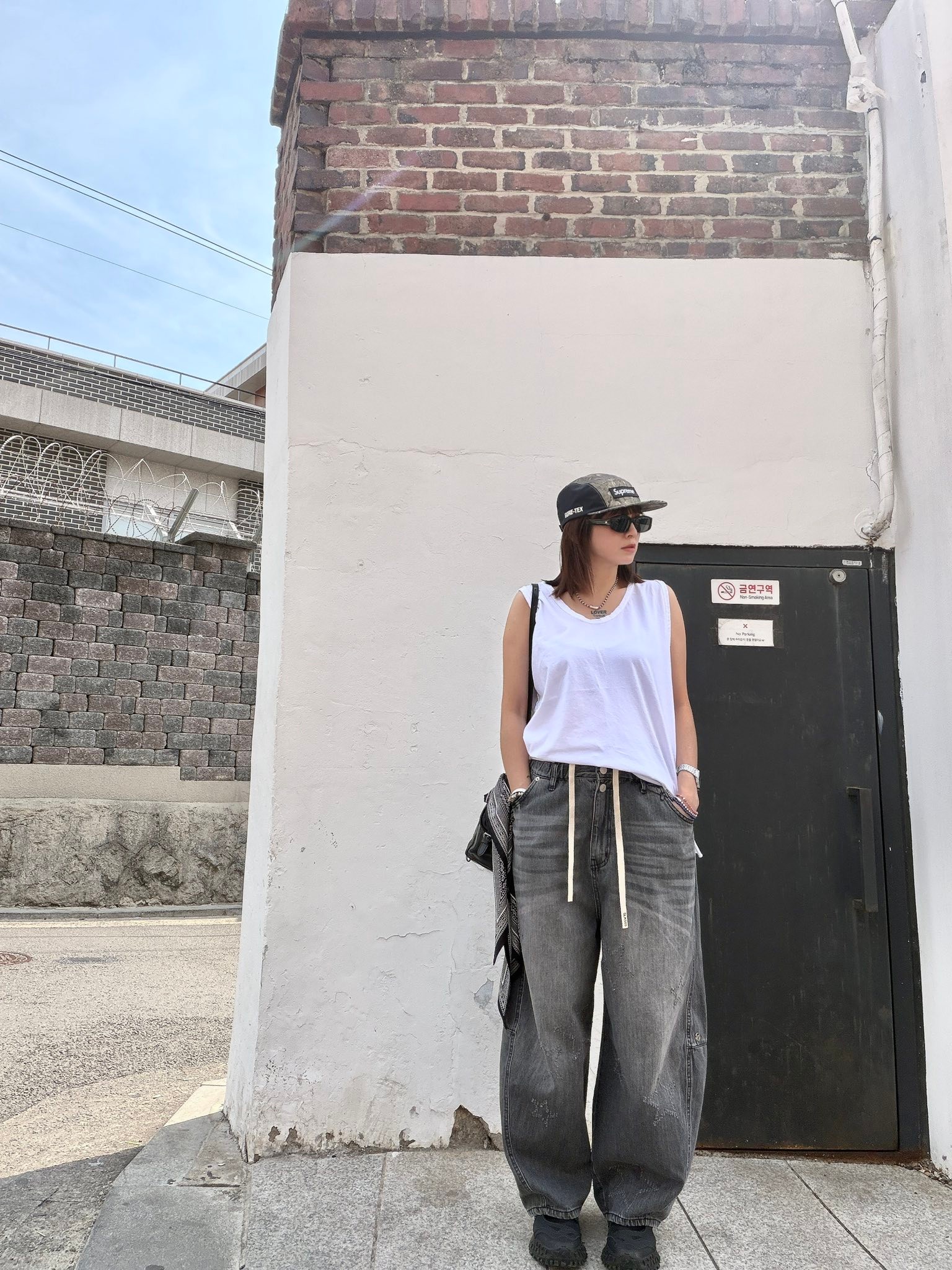 而是帶一點自然刷白層次,立體繭型褲管,從腰臀一路往下都保留了空間感,